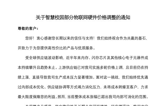 关于智慧校园部分物联网硬件价格调整的通知