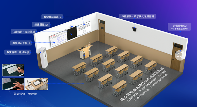 物理空间:以依能领讲・智教舱为核心的智慧教室,符合双大屏幕、面对学生精细板书、无尘黑板、讲台居中布置、教室专用声学系统五大特性,打造更友好的教学环境;